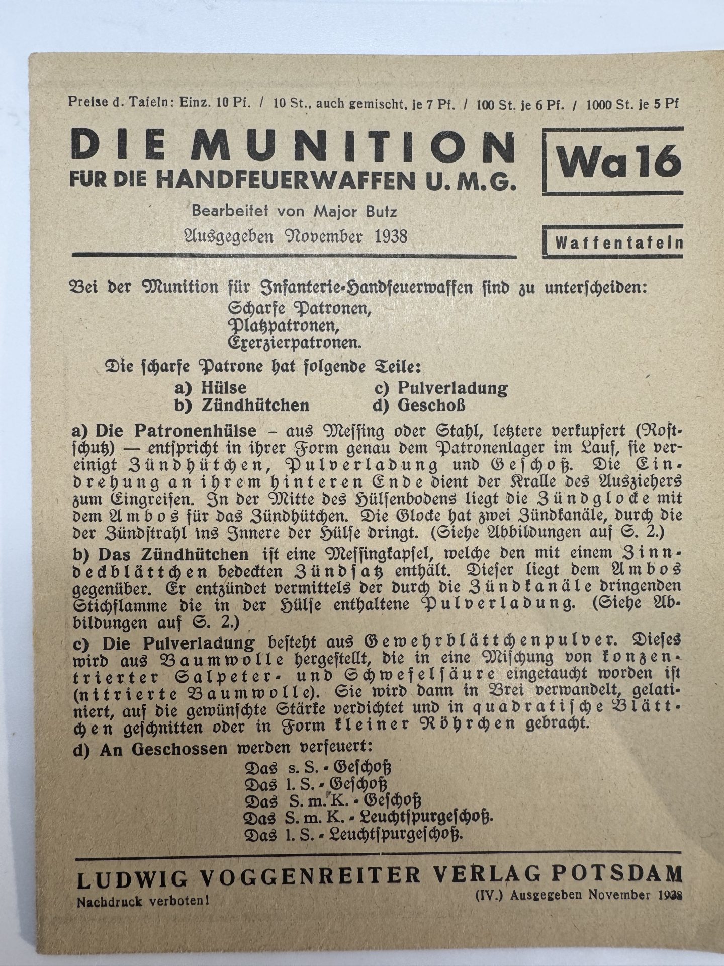 Deutsches Militärhandbuch – Die Munition für die Handfeuerwaffen u. M.G. (Wa 16) – November 1938