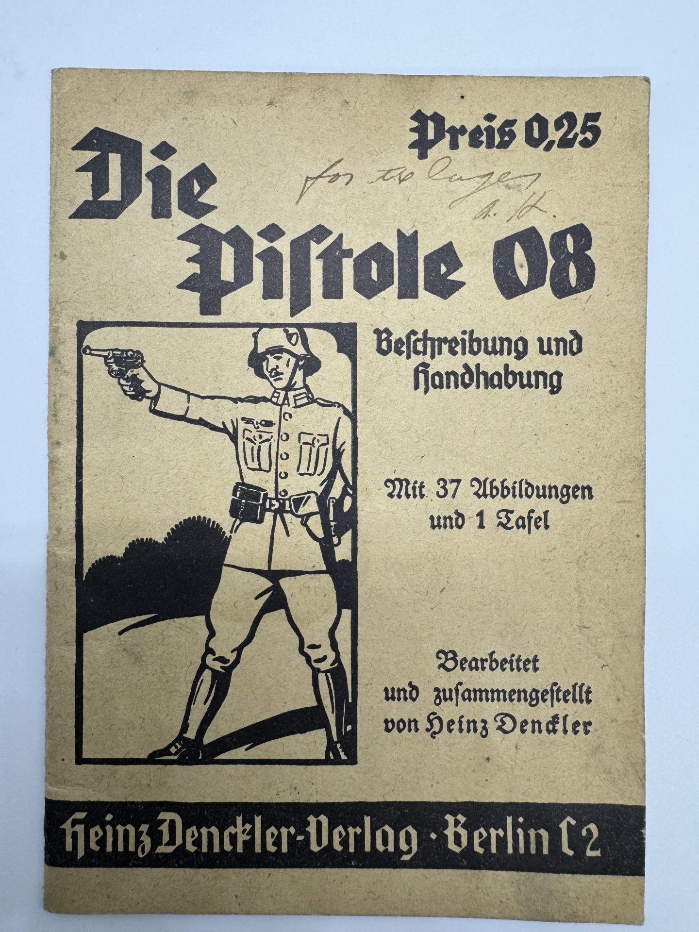 Original German instruction manual titled Die Pistole 08, written by Heinz Denckler and published in Berlin in 1935.