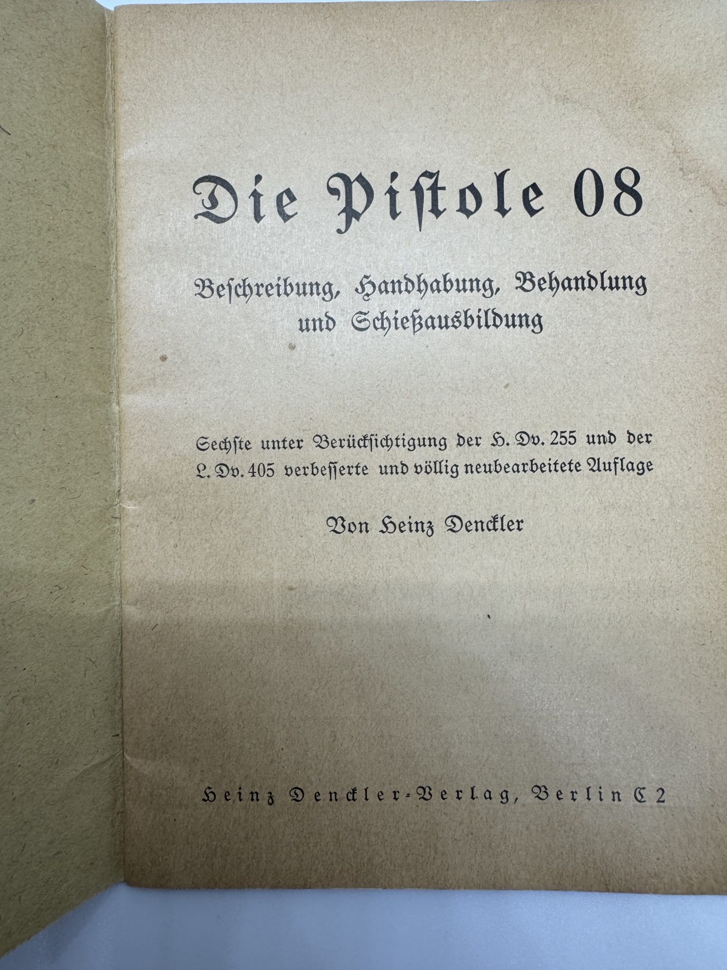 Originales deutsches Ausbildungs- und Handbuch Die Pistole 08, bearbeitet von Heinz Denckler, erschienen 1935 im Heinz Denckler-Verlag, Berlin.