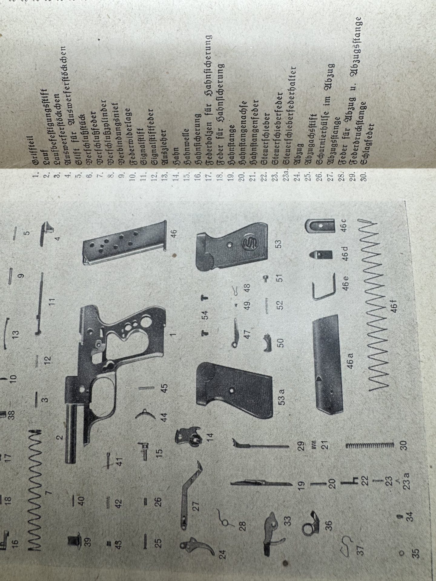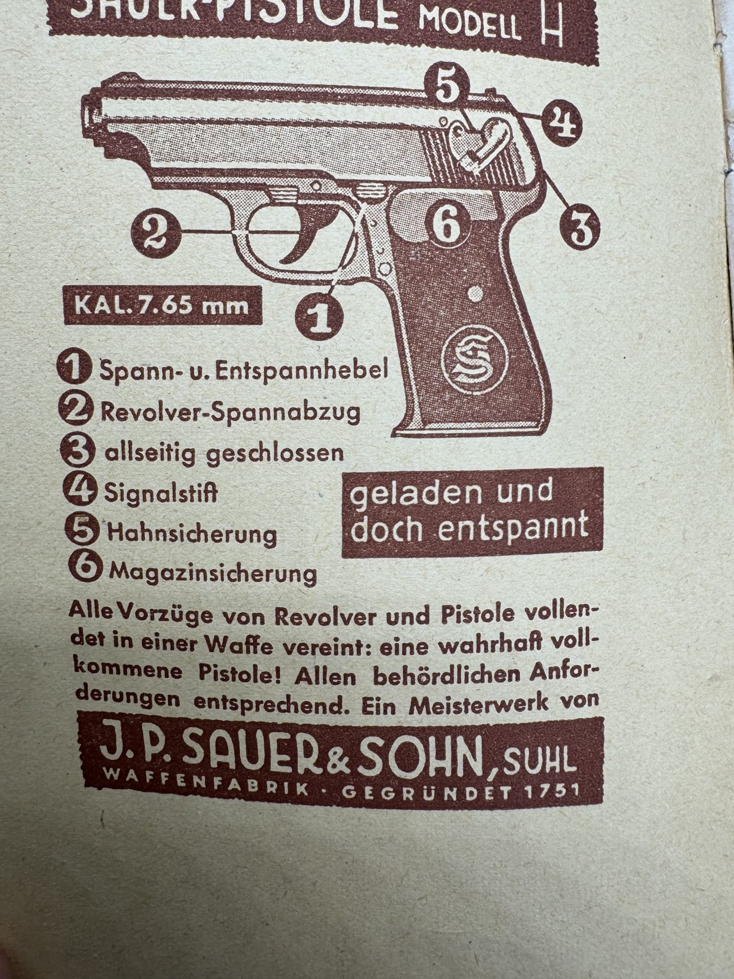 Original German manual – Sauer Pistol Model H (38H) – 7.65 mm