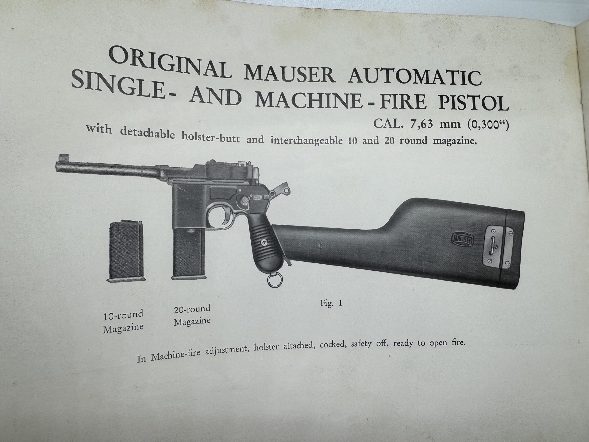 Original Mauser publication describing the Mauser Automatic Single- and Machine-Fire Pistol, calibre 7.63 mm (.30 Mauser), dated September 1933 and written in English for export markets.